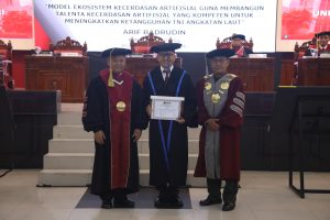 Dalam sidang tersebut, promovendus mempertahankan disertasi berjudul “Model Ekosistem Kecerdasan Artifisial guna Membangun Talenta Kecerdasan Artifisial yang Kompeten untuk Meningkatkan Ketangguhan TNI Angkatan Laut”. Disertasi ini mengkaji tantangan strategis TNI Angkatan Laut dalam menjaga keamanan wilayah laut yurisdiksi nasional yang luas dan dinamis, yang setiap harinya dilintasi ribuan kapal dengan berbagai potensi ancaman.