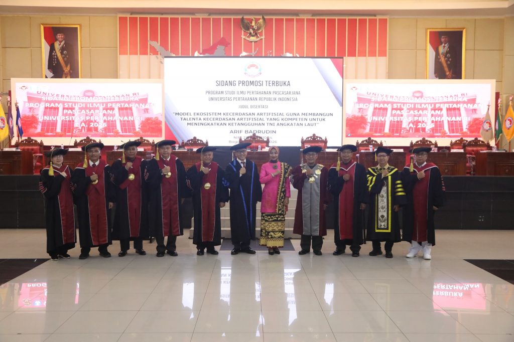 Berdasarkan hasil ujian terbuka dan penilaian dewan penguji, promovendus Arif Badrudin dinyatakan lulus dan berhak menyandang gelar Doktor Ilmu Pertahanan ke-75 Universitas Pertahanan Republik Indonesia. Melalui sidang promosi ini, Unhan RI kembali menegaskan komitmennya dalam melahirkan doktor-doktor yang tidak hanya unggul secara akademik, tetapi juga mampu memberikan kontribusi strategis bagi penguatan sistem pertahanan negara, khususnya dalam pengembangan sumber daya manusia dan pemanfaatan teknologi mutakhir guna mendukung keamanan maritim nasional.